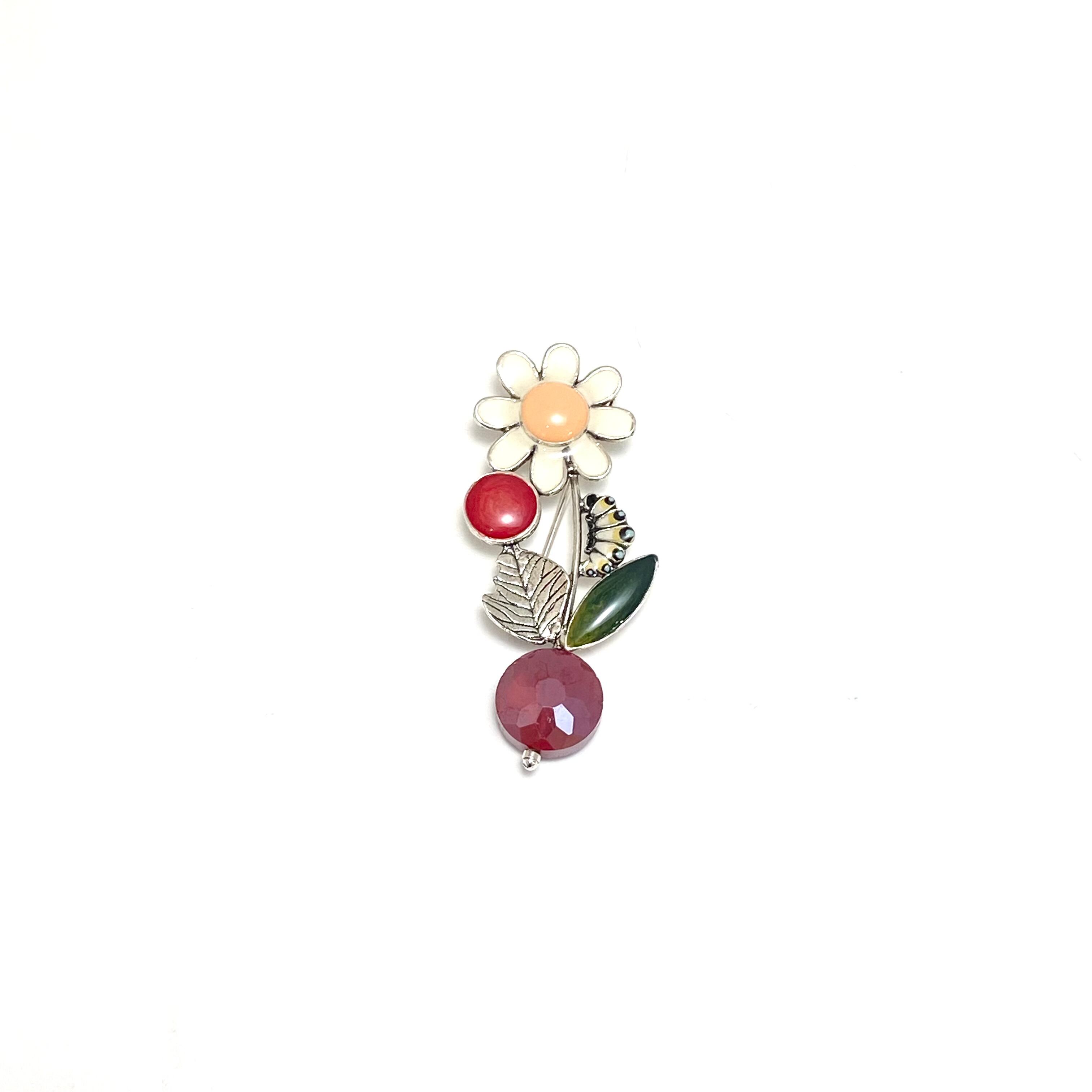 こちらのブローチには繭というよりは蝶の幼虫が葉っぱを食べるためにお花にとまっている様子がデザインされています。