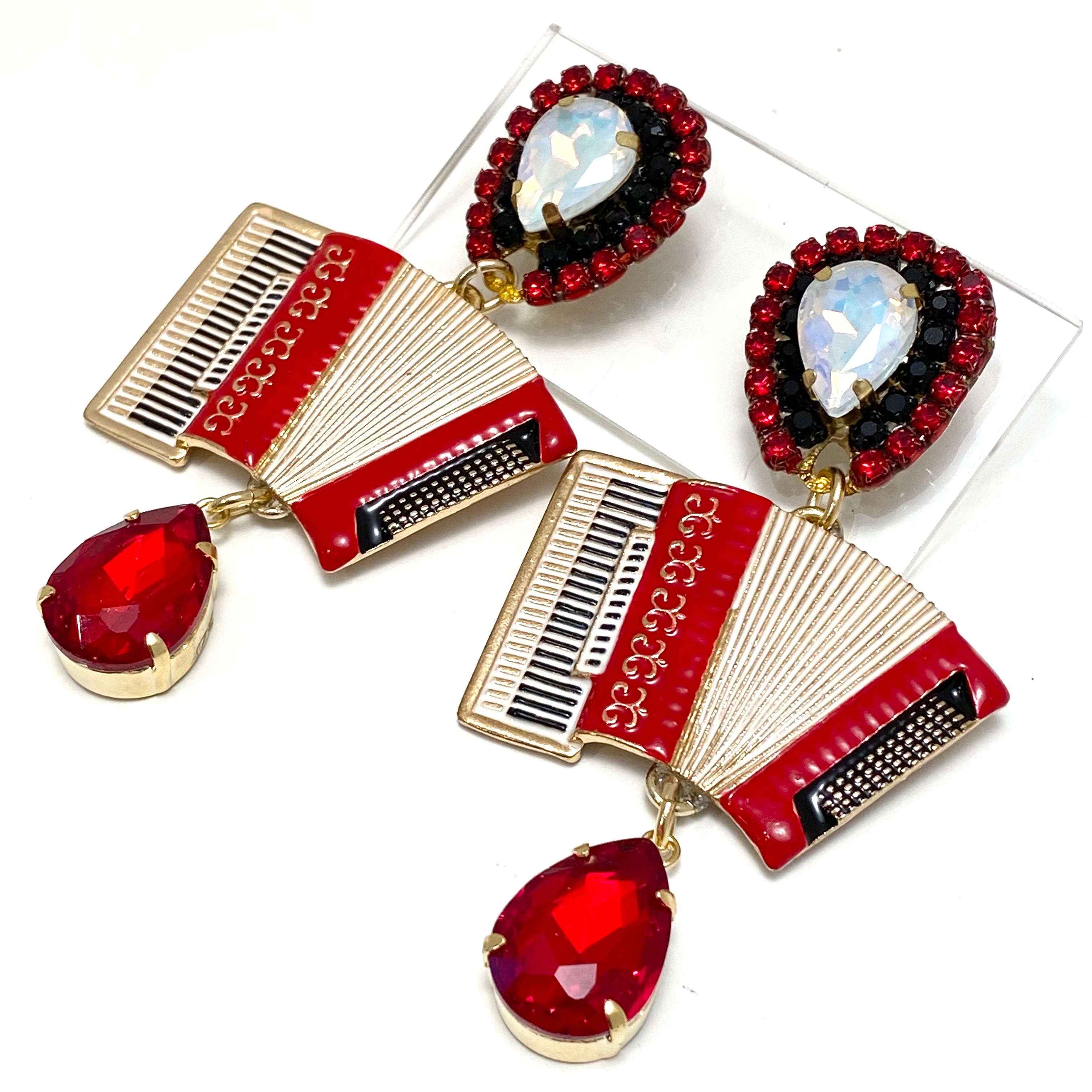 赤と黒のアコーディオンモチーフと、キラキラのドロップガラスが揺れるデザイン。