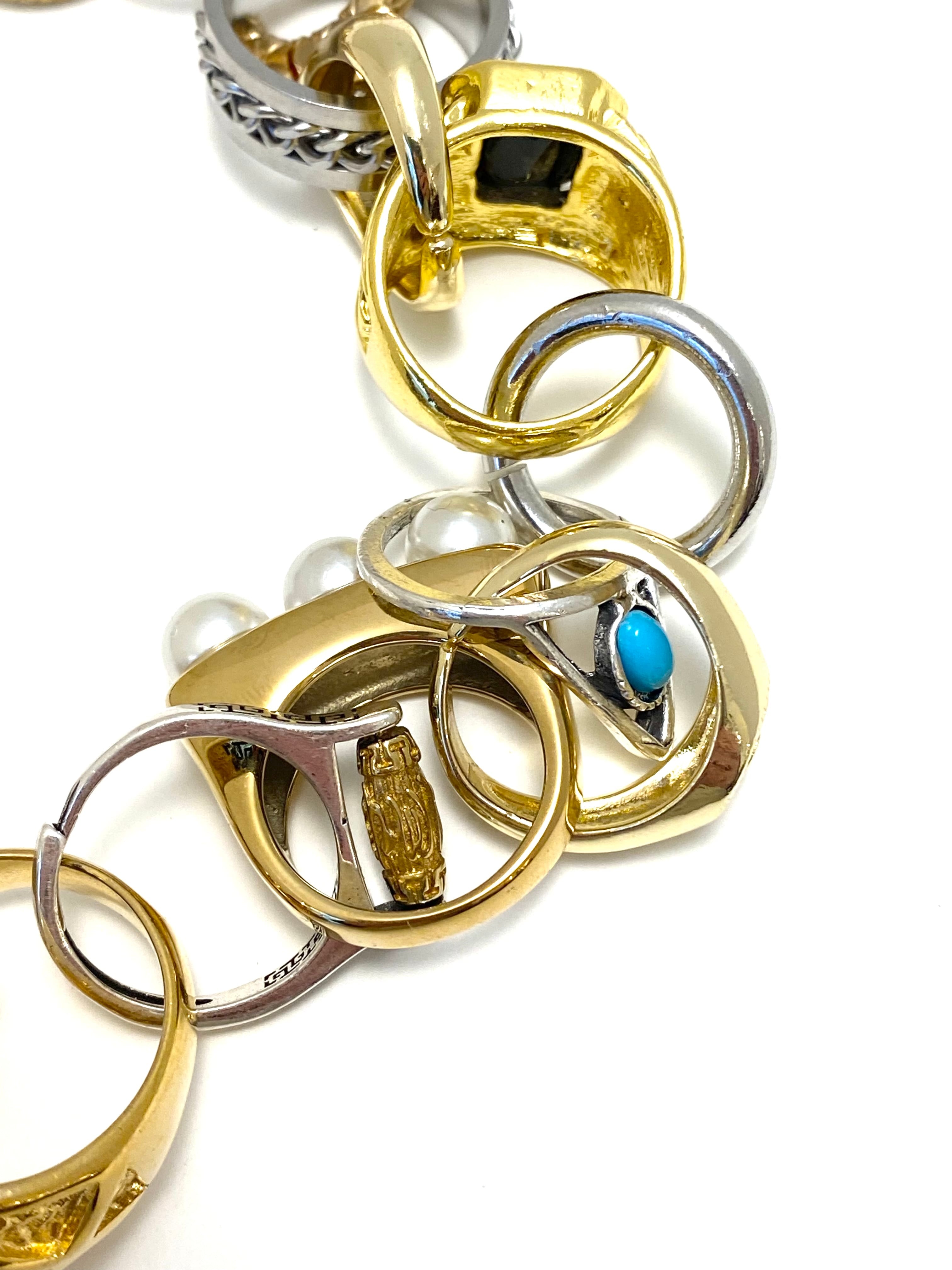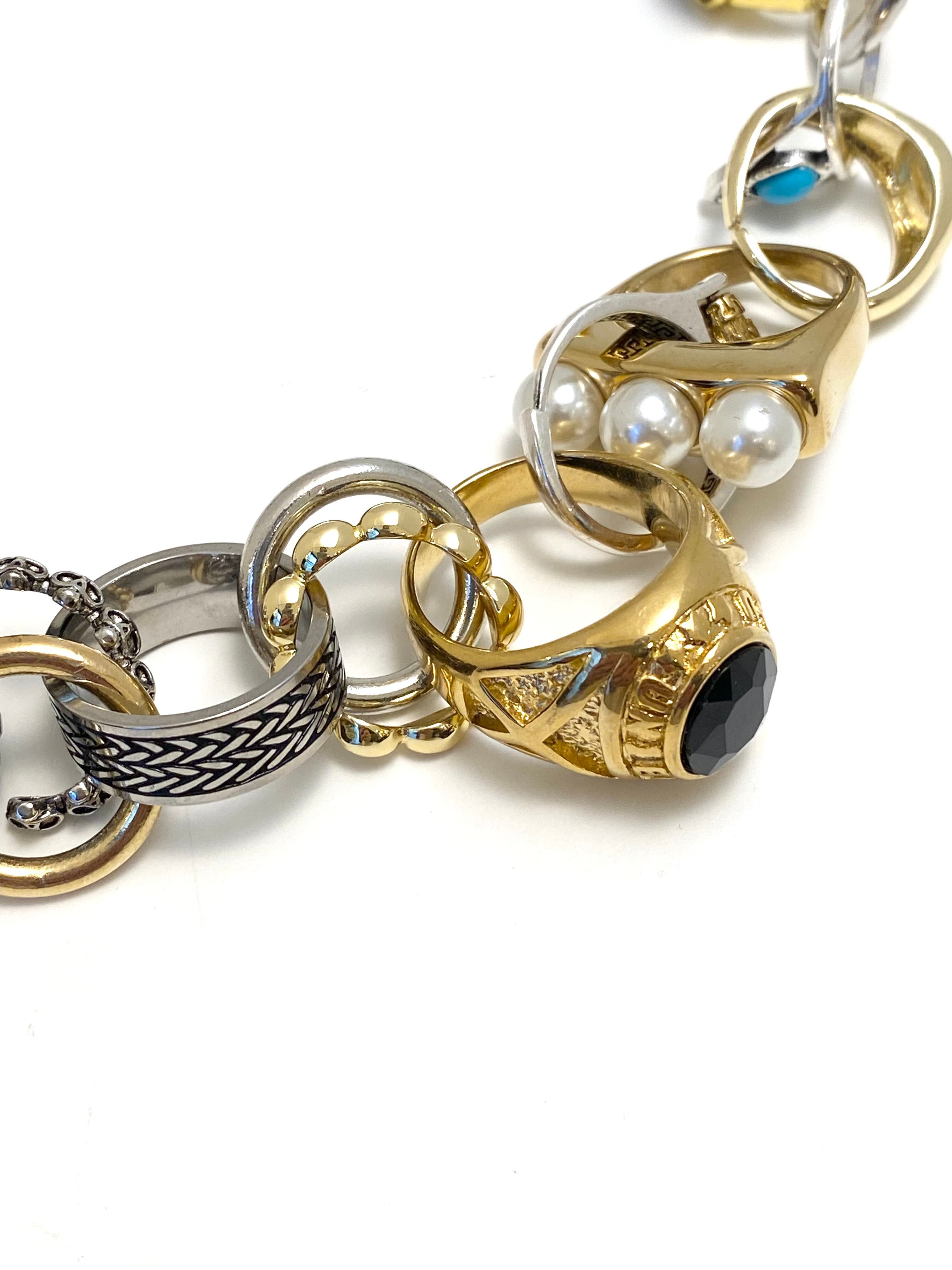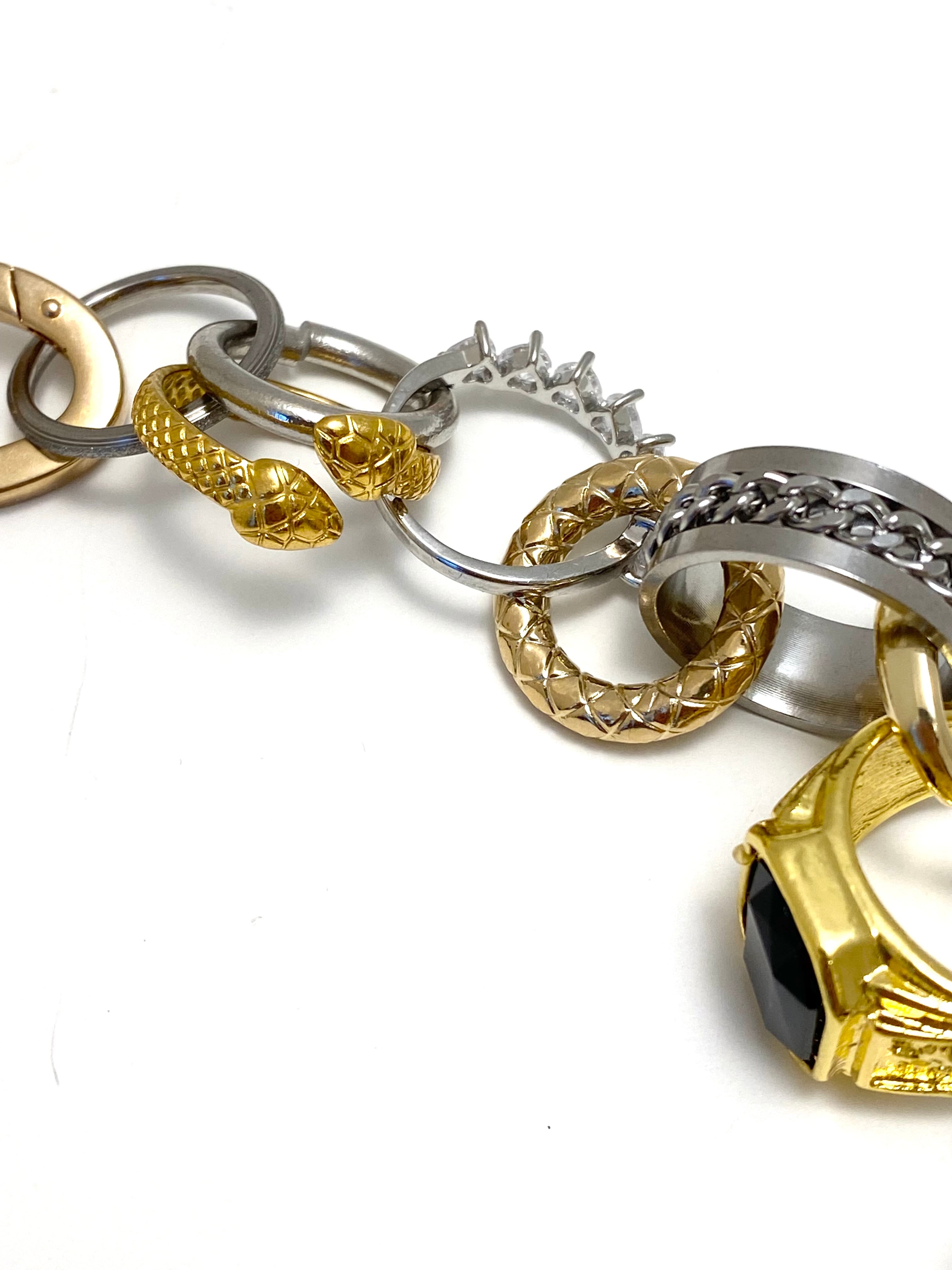 ハートやドクロ、ヘビにチェーンなど、様々なデザインのリングがなんと20個以上も繋がったネックレス。