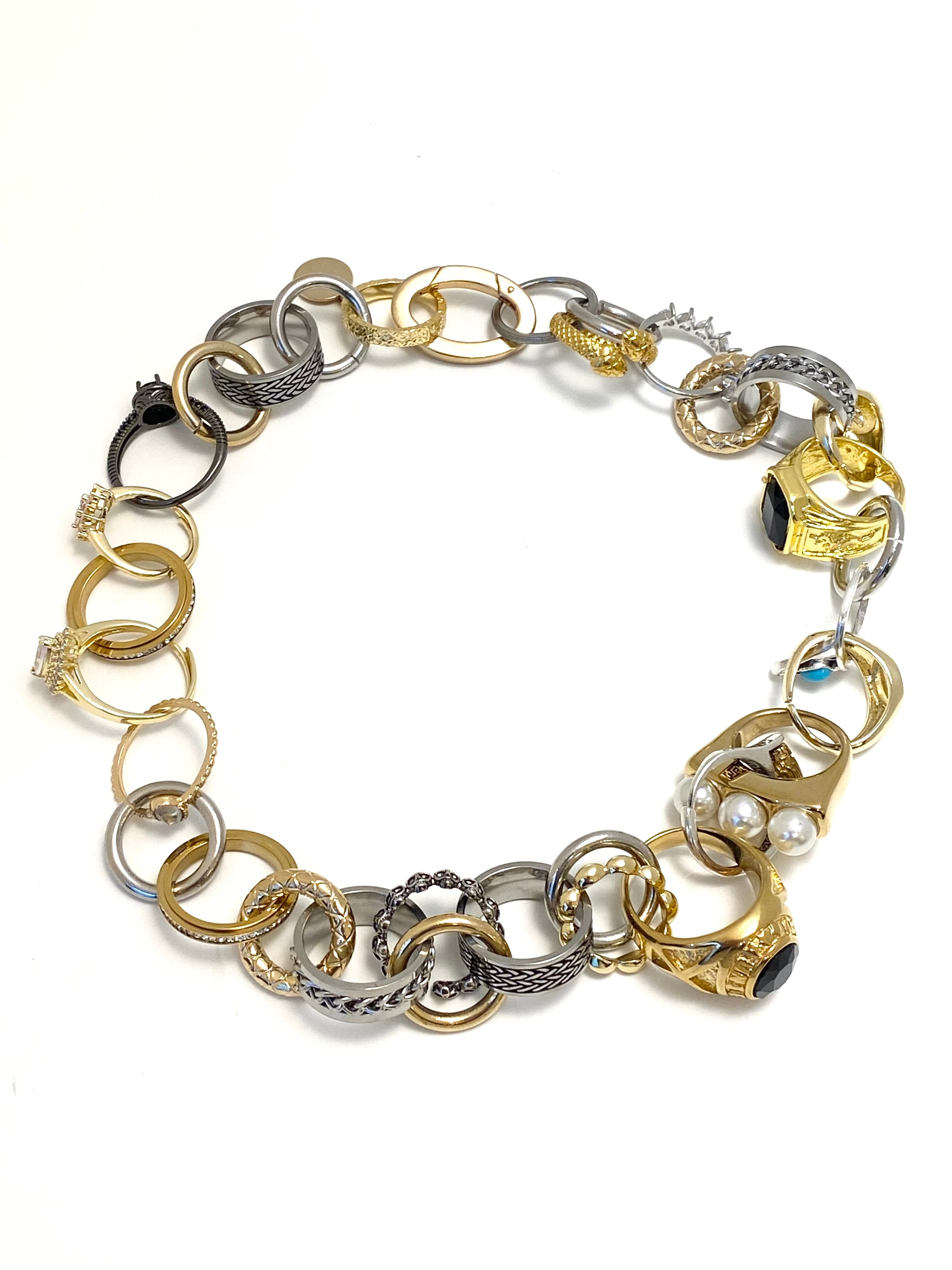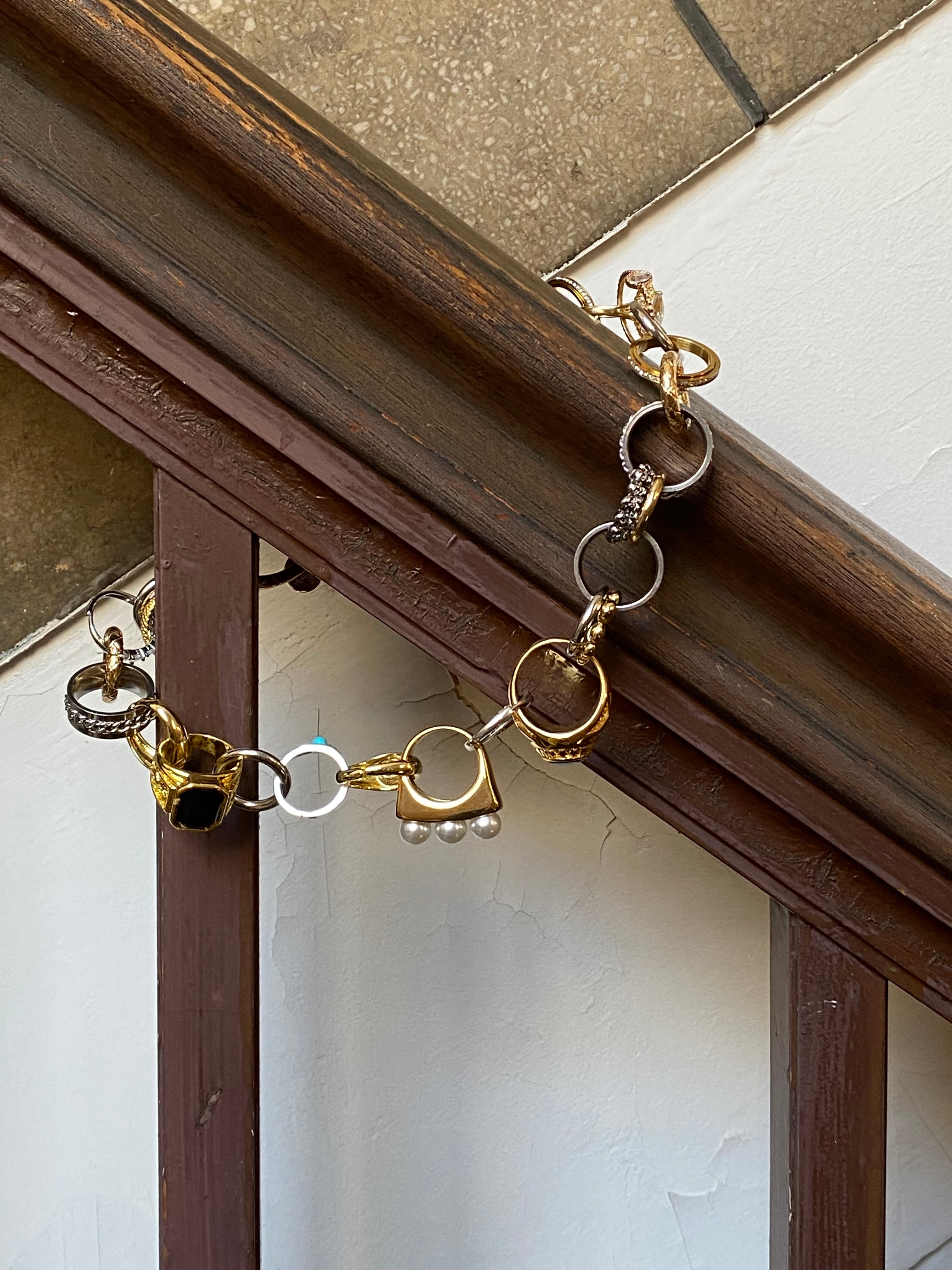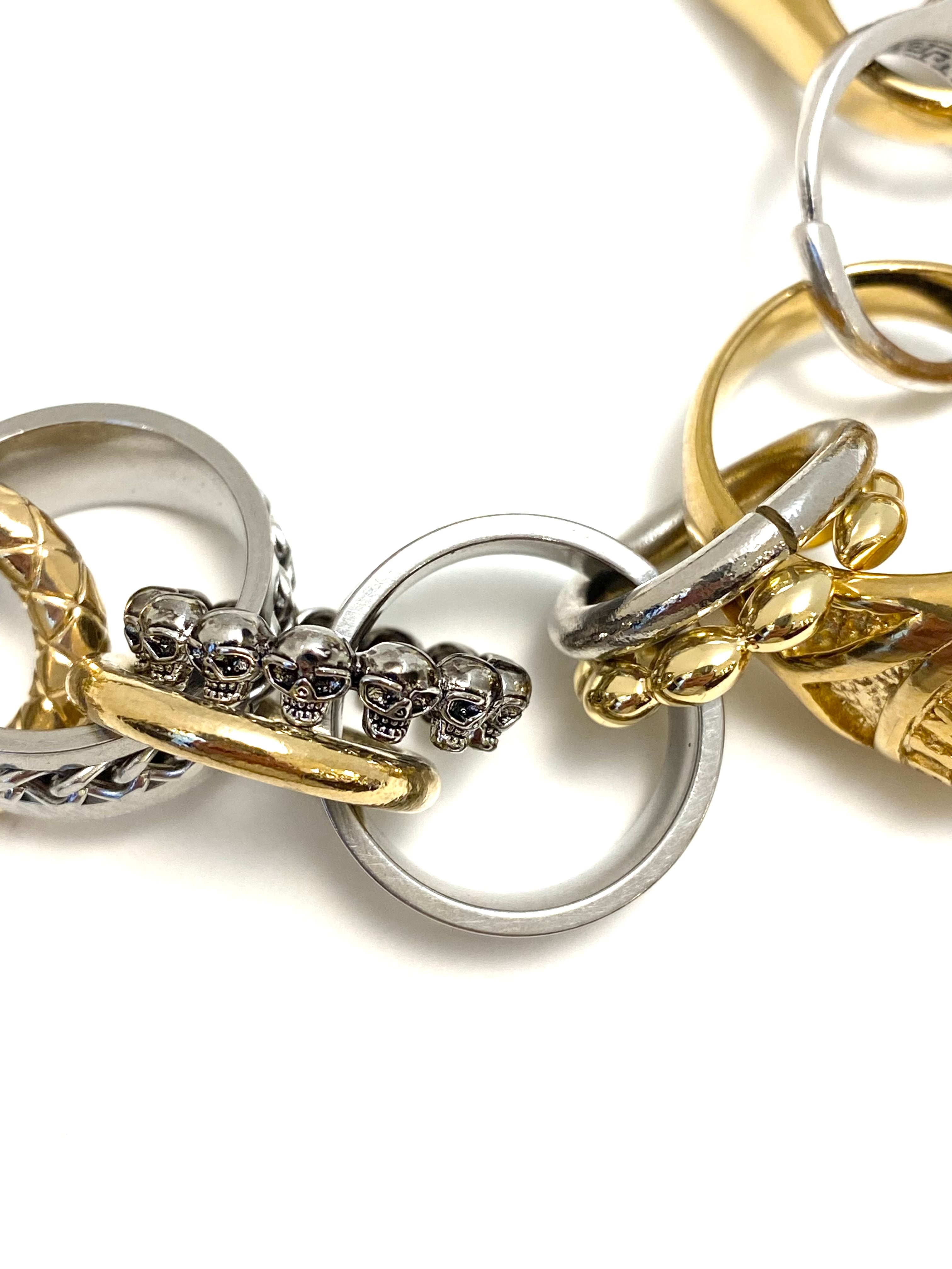 ハートやドクロ、ヘビにチェーンなど、様々なデザインのリングがなんと20個以上も繋がったネックレス。