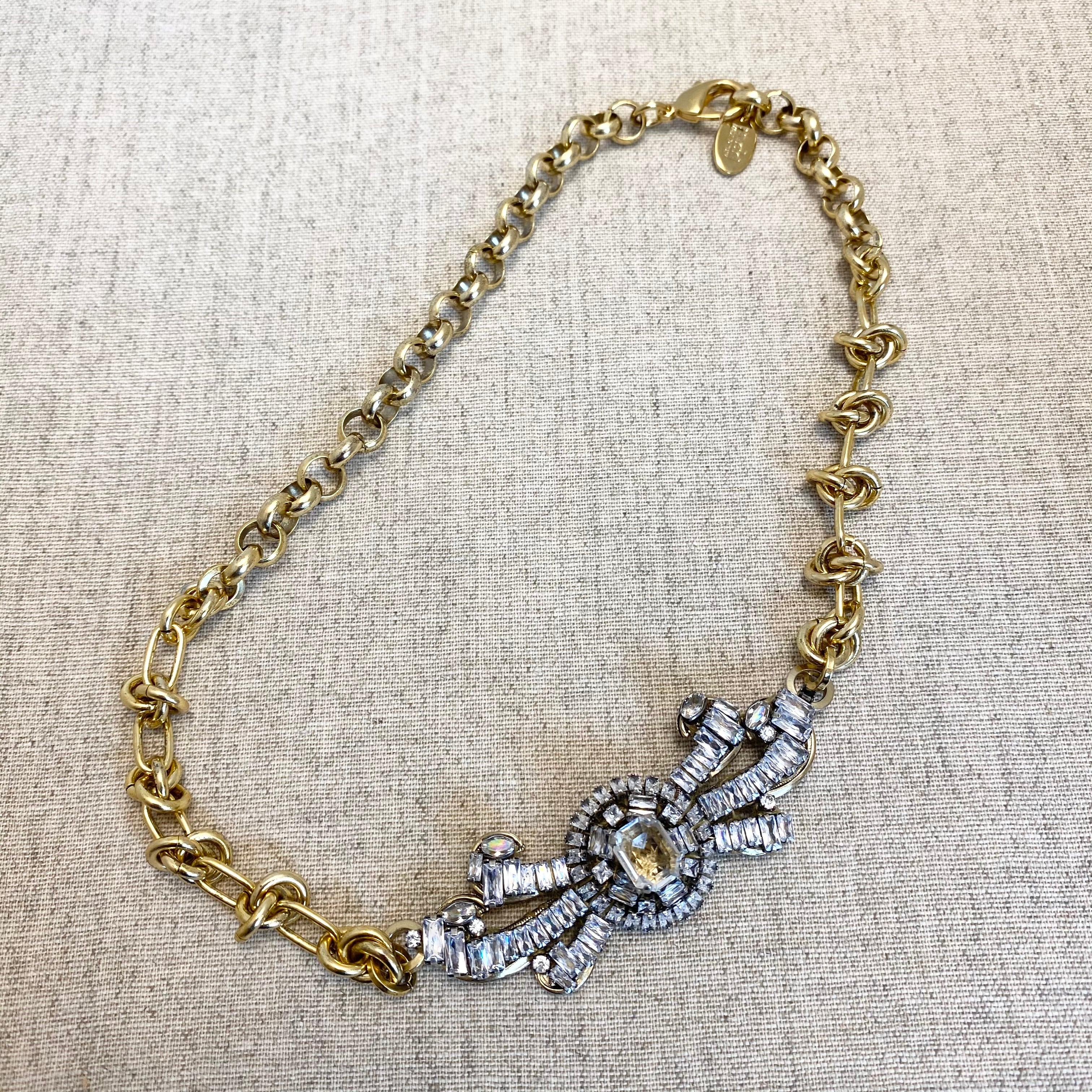 アンティーク調のモチーフをベースに、長方形のクリスタルや複雑なチェーンを組み合わせたネックレス。