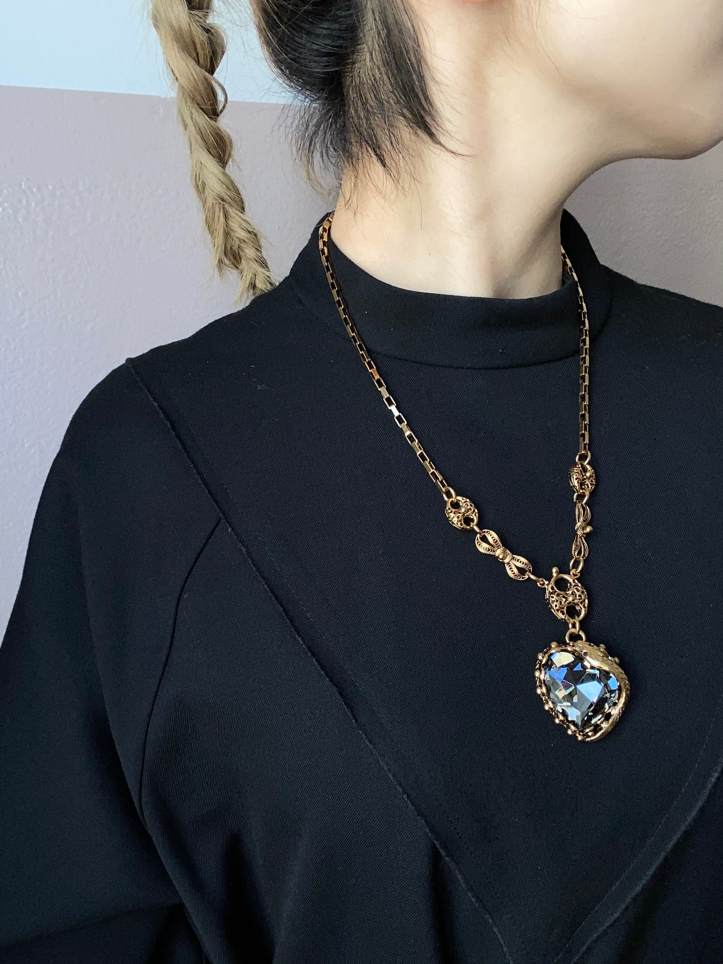 チェーンの中央に配置された美しいメタルワーク、ハートの周りのつぶつぶの装飾など、重厚感を演出するデザインが盛り込まれています。